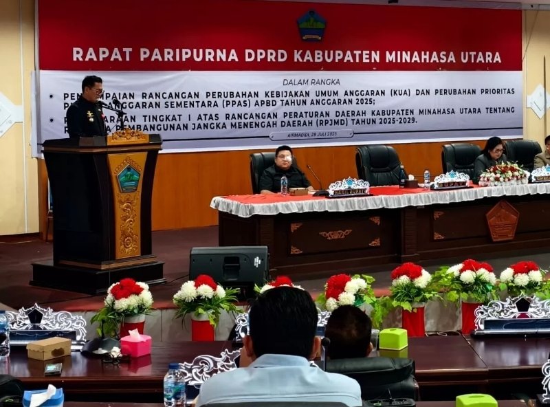 Abadipost.com, MINAHASA UTARA — Pemerintah kabupaten Minahasa Utara, Bupati Joune Ganda didampingi Wakil Bupati Kevin William Lotulung hadir dalam Sidang Paripurna untuk membahas Rancangan Peraturan Daerah (Ranperda) tentang Rencana Pembangunan Jangka Menengah Daerah (RPJMD) yang digelar oleh Dewan Perwakilan Rakyat Daerah (DPRD) Minahasa Utara tahun 2025-2029.