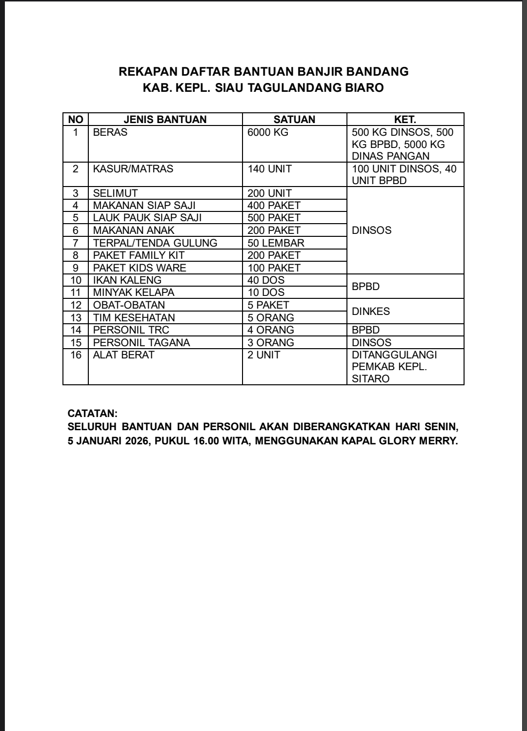 Ia menegaskan telah berkoordinasi dengan Pemkab Sitaro, TNI, dan Polri untuk memastikan bantuan tersalurkan secara tepat sasaran.